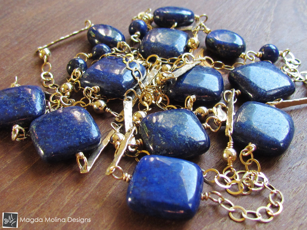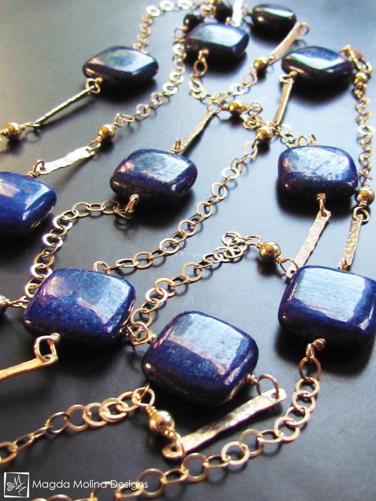 I just love this combination: cool & soothing Lapis Lazuli stones set in warm & comforting gold. I made all the gold connector bars from scratch with 14K gold filled wire, and hammered them to create an interesting texture. I wire-wrapped all the stones carefully and put all the parts together to create this stunning adornment.