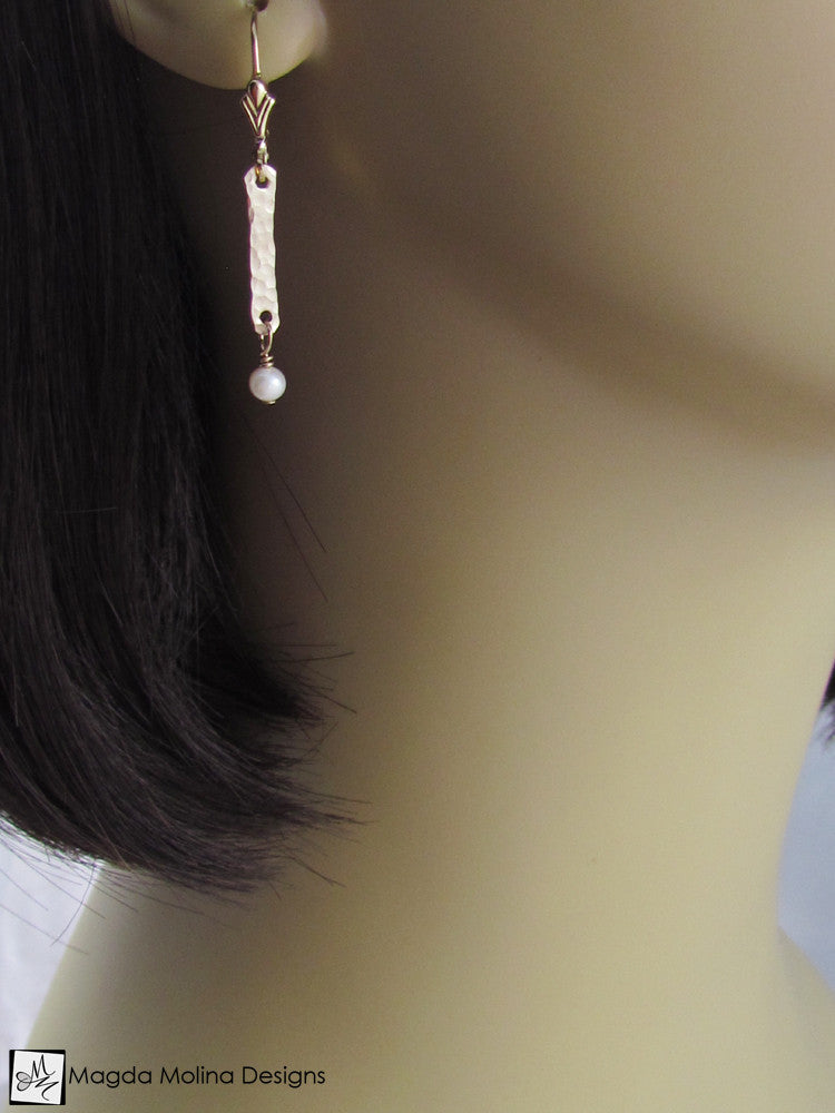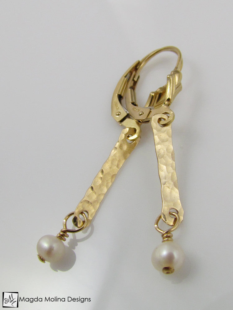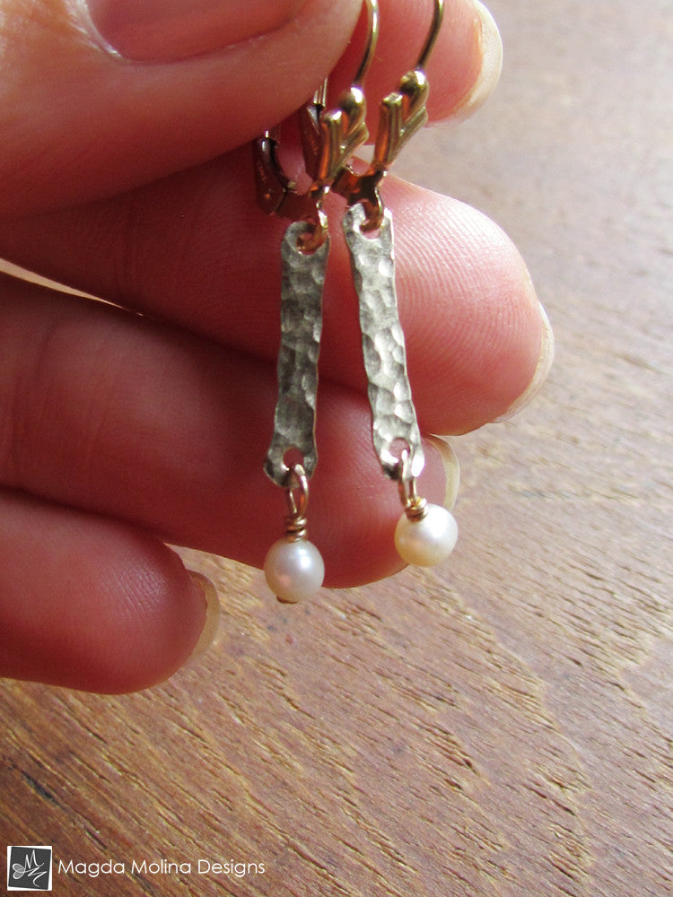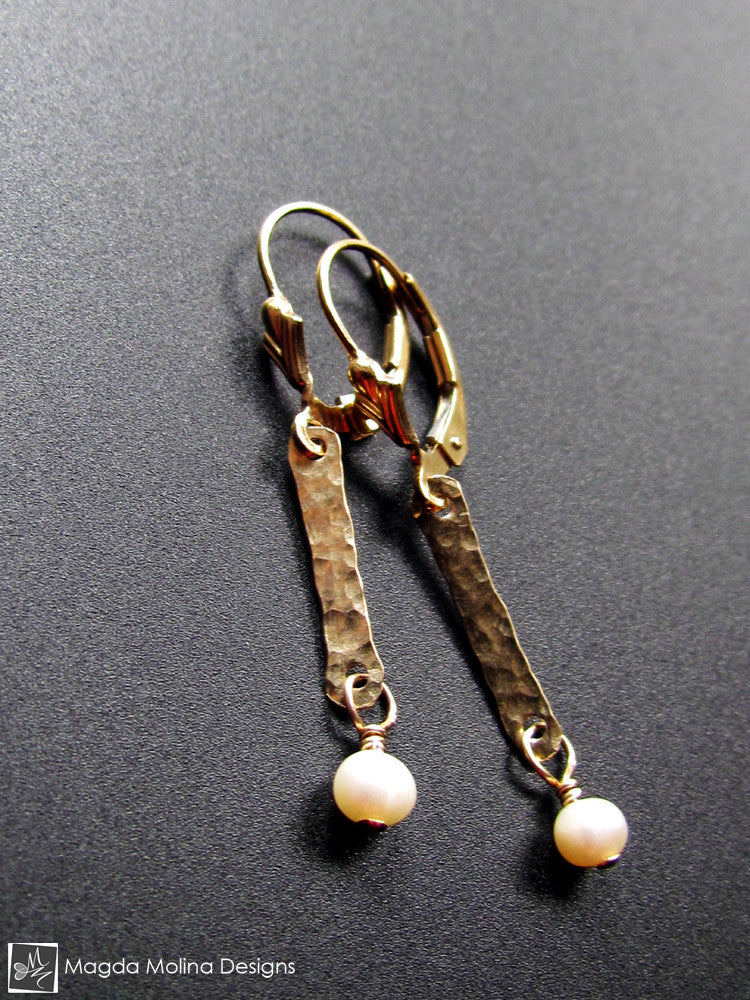 These elegant and ultra delicate earrings were hand formed out of 14K gold filled wire and then hammered to create the interesting texture. I then wire-wrapped dainty Freshwater Pearls onto them for a perfect and very classy complement. The design is simple and delicate, yet unique and extremely feminine.